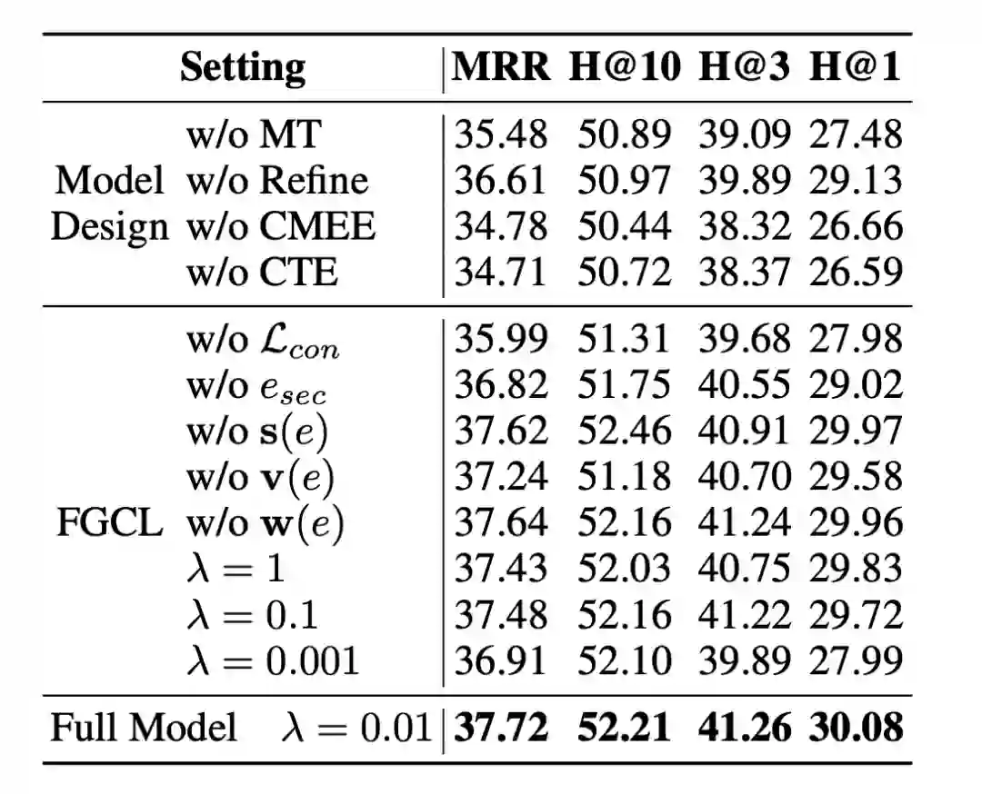 为了证实MyGO中每个模块的有效性,我们进一步从两个角度进行了消减研究:模型设计和FGCL损耗。我们删除了不同设置下的相应模块,并进行了MMKGC实验。实验结果如表所示。 根据第一部分的实验结果,我们在骨干网络、模态标记化过程和过滤过程中设计的所有核心模块都对最终预测结果产生了关键影响。此外,FGCL 的设计也对模型性能有所影响,其中 中的对比候选码对实现 SOTA 性能至关重要。同时,我们探索了 FGCL 的损失权重 的影响。当我们在 中调整时,MMKGC结果呈现出先上升后下降的趋势,并在时达到了最先进水平。总的来说,我们可以发现影响整体性能最关键的模块是 CMEE 和 CTE,它们提取细粒度的上下文实体表征,从而进行模态感知的三重预测。FCGL 模块在骨干的基础上进一步提高了模型的性能。 四、总结在本文中,我们重点讨论了在 MMKG 中捕捉细粒度语义信息的问题。我们提出了一个新框架MyGO 来处理、融合和增强多模态实体表征。公共基准实验证明了我们设计的有效性、可靠性、合理性和可解释性。未来,我们将专注于处理和解释 MMKG 中的细粒度多模态信息。