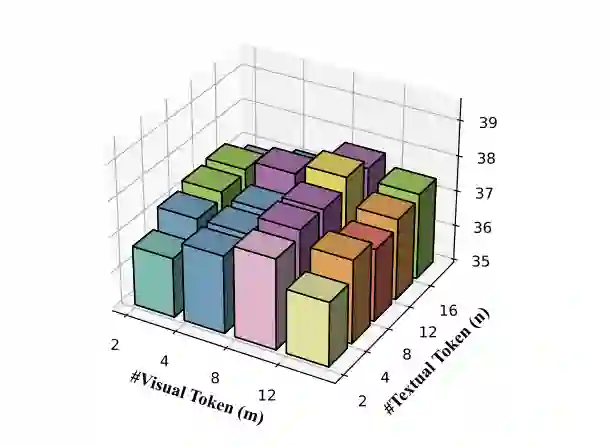另一个值得研究的方面与我们在 MT 中设置的两个标记量超参数 和 有关。这些参数决定了 CMEE 所保留和处理的高频多模态标记的数量。更多的标记与模型中更复杂的交互相关联,其时间效率将提高 。这是因为 CMEE 中使用的 Transformer 层的时间复杂度与序列长度的二次方呈正相关。因此,我们探讨了 MMKGC 在参数 和 变化时的性能。 实验结果以三维条形图的形式如图所示。从图中我们可以观察到,随着标记数 和 的增加,模型性能呈现出先上升后下降的趋势。