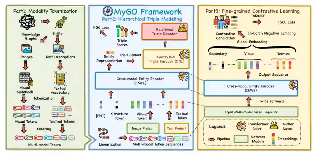 我们的设计有三个关键组件:模态分词、层级化三元组建模,以及细粒度对比学习,如下图所示: