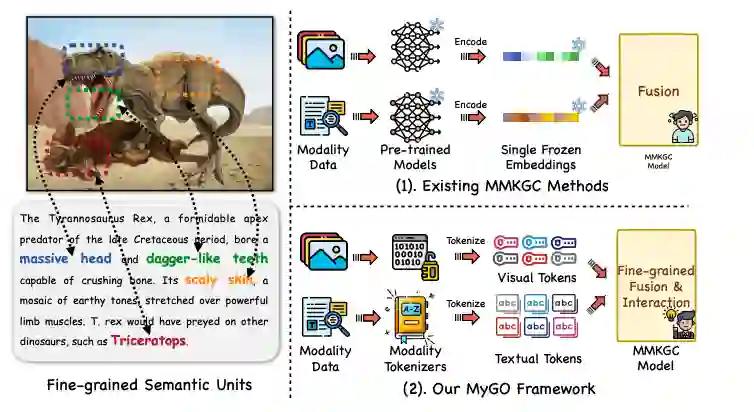 为解决这一不足,我们引入了一个新颖的框架 MyGO,用于切分、融合和增强细粒度多模态实体表征,并增强多模态知识图谱的多模态实体识别能力。实体的细粒度多模态表征,并提高 MMKGC 的性能。受标记化技术的启发,MyGO 将多模态实体信息标记为细粒度的离散标记,并通过跨模态实体编码器学习实体表征。为了进一步增强多模态表征,MyGO 加入了细粒度对比学习,以突出实体表征的特殊性。论文在标准的MMKGC 基准上进行的实验表明,我们的方法超过了 19 种最新模型,从而彰显了其卓越的性能。如下图所示,我们的方法和传统的MMKGC方法最大的区别在于,通过引入了各种模态的分词器(Tokenizer),进行了更加细粒度的表示学习架构的设计。