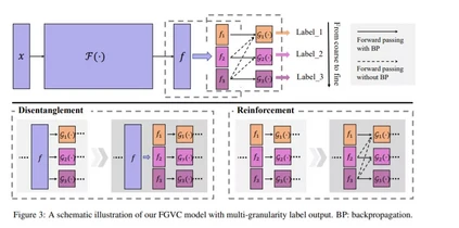 该文被大会录用为Oral论文,是北京邮电大学与英国萨里大学“北邮-萨里人工智能联合实验室”的联合研究成果,指导老师是来自人工智能与网络搜索教研中心的郭军教授、马占宇教授和萨里大学CVSSP中心SketchX Lab的Yi-Zhe Song教授。人工智能学院博士生常东良同学为论文一作。本文首先通过一个Human Study 发现了传统细粒度图像分类任务无法满足大多人需求的问题,进而重新定义了该任务:从单标签分类任务拓展为按照预先定义的层次化标签(从粗粒度到细粒度)进行自上而下的多标签分类任务。此外,通过实验发现粗粒度标签预测任务会抑制细粒度特征的学习,而细粒度标签预测任务则会促进粗粒度特征的学习。该发现促使我们设计了一个简单且高效的解决方案来解决本文提出的新任务:(1)利用与粒度相关的分类器将粗粒度特征与细粒度特征进行解耦;(2)通过一个梯度控制器使得细粒度特征能够参与粗粒度分类器的决策。实验表明,本文提出的方法在新的细粒度图像分类任务中获得了最佳的性能。