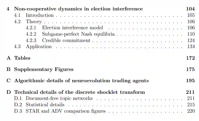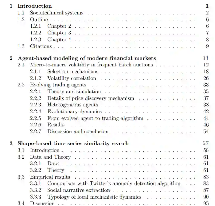 社会技术系统是人类和算法的集合,它们在分散控制器的部分监督下进行交互。这些系统通常显示出复杂的动态变化,并以其独特的突发行为为特征。在这项工作中,我们描述、分析和模拟了三类不同的社会技术系统:金融市场、社交媒体平台和选举。虽然我们的工作在主题内容上多种多样,但通过研究社会系统中由进化和适应驱动的变化以及开发用于推断这种变化的方法,我们的工作是统一的。