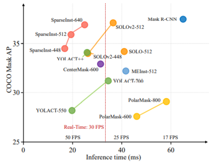 在速度和精度上与现有实时实例分割算法的比较
