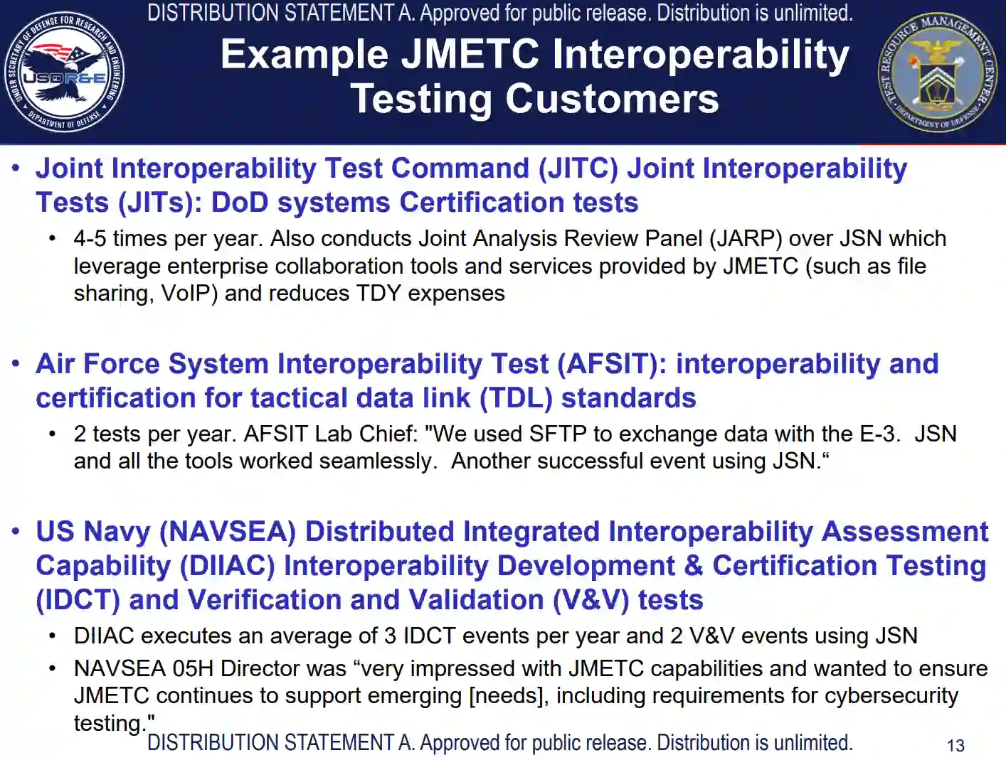 支持测试,以验证/测量系统和系统的联合互操作性,以及在一个强大的、与作战相关的环境中执行联合任务的有效性。