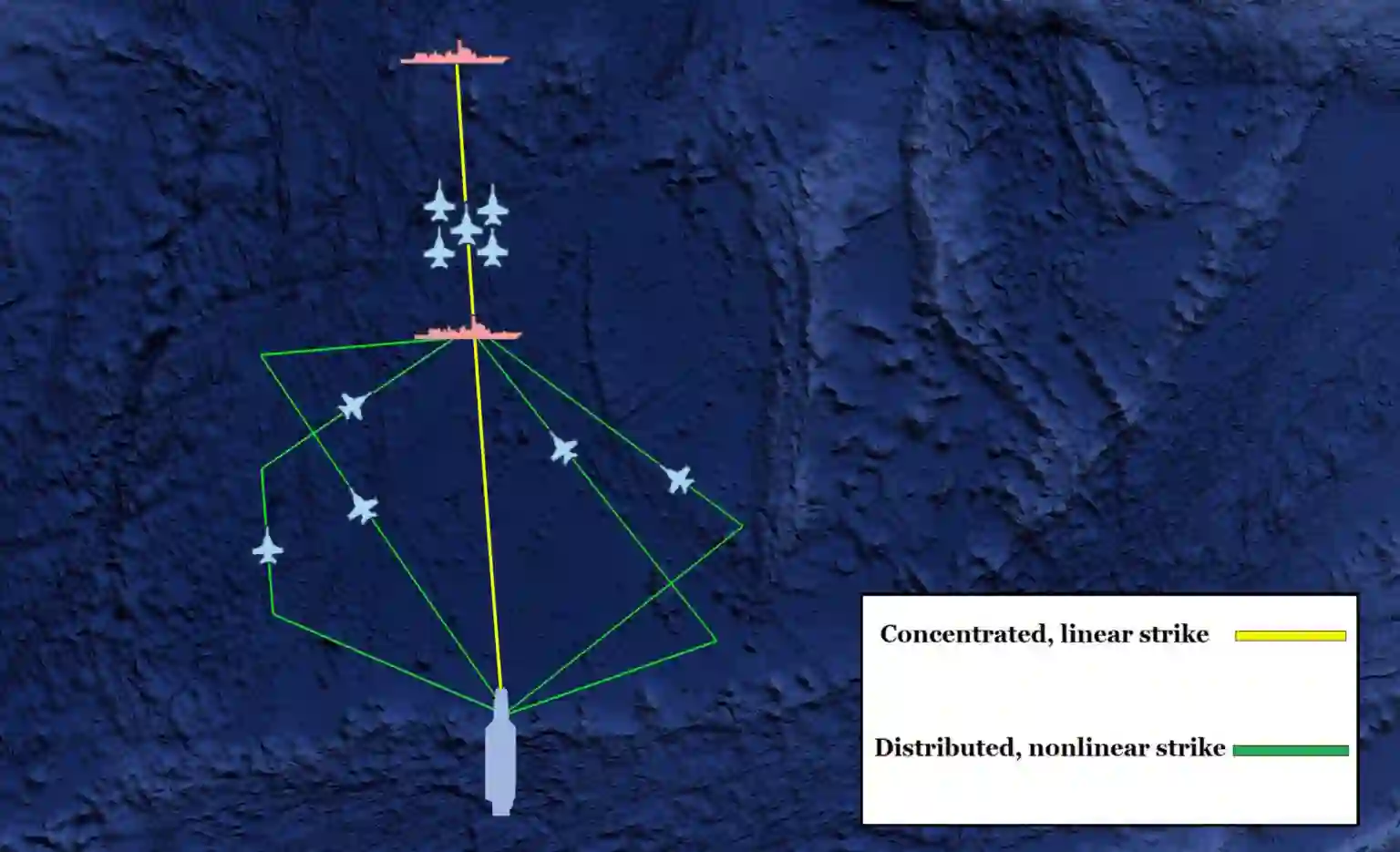 在管理航空母舰的特征时,不仅要考虑航空母舰的特征,还要考虑航空联队的特征。机翼行动的特征和足迹可以掩盖或暴露航母的位置。要最大限度地扩大航空联队发动大规模反舰攻击的距离,就必须采用更线性的飞行路线往返于目标之间,在整个飞行路线上密集地部署飞机,并采用更高的飞行高度,这样既能延长攻击距离,又能提高飞机的可探测性。尽管线性飞行路径能最大限度地拉近与目标的距离,但由于其可预测性,更容易将对手引回航母。