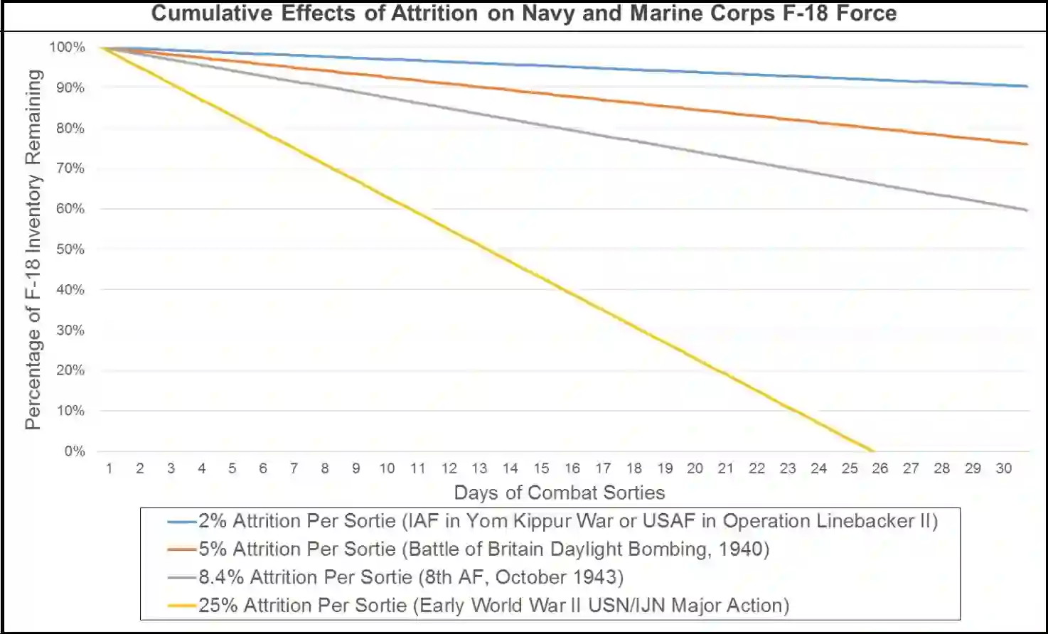 飞机减员率可视化。(图片来源于 Seth Cropsey、Bryan G. McGrath 和 Timothy A. Walton 的幻灯片 "锋利的长矛: Seth Cropsey、Bryan G. McGrath 和 Timothy A. Walton,哈德逊研究所,2015 年 10 月)。