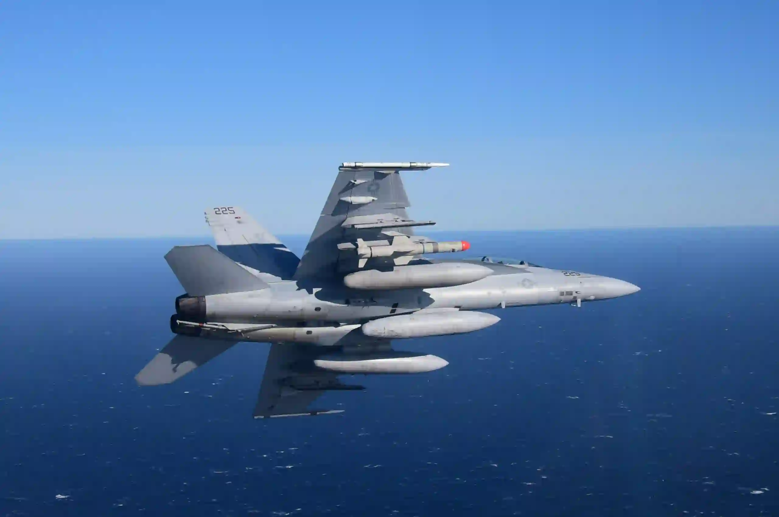 2015年11月--一架装备有 "鱼叉 "Block II+导弹的F/A-18战斗机在加利福尼亚州穆古点海上靶场进行自由飞行试验。(美国海军照片)