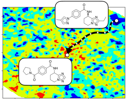 生成模型分子结构的文本表示首次应用的是SMILES(Simplified Molecular Input Line Entry System)字符串,进而将SMILES转换成连续向量,然后根据所需要的性质进一步优化。优化后的新向量再被解码成一个代表输出分子的SMILES字符串。 在SMILES表征的基础上,研究人员又开发了能够有效处理分子图的编码和解码算法,这种方法可明确地捕获官能团及其空间排列,以及分子整体骨架等信息。 最近的研究进一步增加了分子的三维信息表示方式,探索了寻找优化分子的替代算法。其中一种方法是用给定的起始分子及改进性质后的对应分子作为配对进行训练。这种方法可以被看作是匹配分子对分析(Matched MolecularPairs Analysis, MMPA)的神经网络版本,其中模型在隐藏空间中学习轨迹,即使隐藏空间不平滑,也具有鲁棒性,并支持生成不同的输出(如图4)。