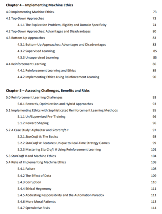 在第四章中,我为自下而上的强化学习方法最适合于实现机器伦理的观点进行了辩护。首先,我研究了自上而下的机器伦理实施方法,然后评估了自下而上的机器伦理实施方法,并最终得出结论,即使与其他自下而上的机器学习技术相比,强化学习技术也最适合养成伦理机器。
