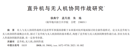 有人与无人协同作战样式是世界军事强国着眼于未来强对抗环境而探讨的全新作战样式。论文从直升机与 无人机协同作战概念出发,探讨了直升机与无人机协同的基本模式,构想了直升机与无人机协同典型作战行动,旨在为有无 人作战协同提供思路,有一定参考价值。鉴于直升机独特性能优势,世界军事强国正加 紧直升机与无人机协同应用研究并投入战场使用, 深入探索无人机与直升机的集成方法,研究直升机 与无人机协同作战概念及关键技术,形成完善的作 战理念及战术战法,致使未来无人机和直升机在相 互协同时,以最有效的方式发挥各自优势,共享战 场信息,进行相互支援、相互保障和相互掩护,协同 完成作战任务,达成“1+1”大于2。