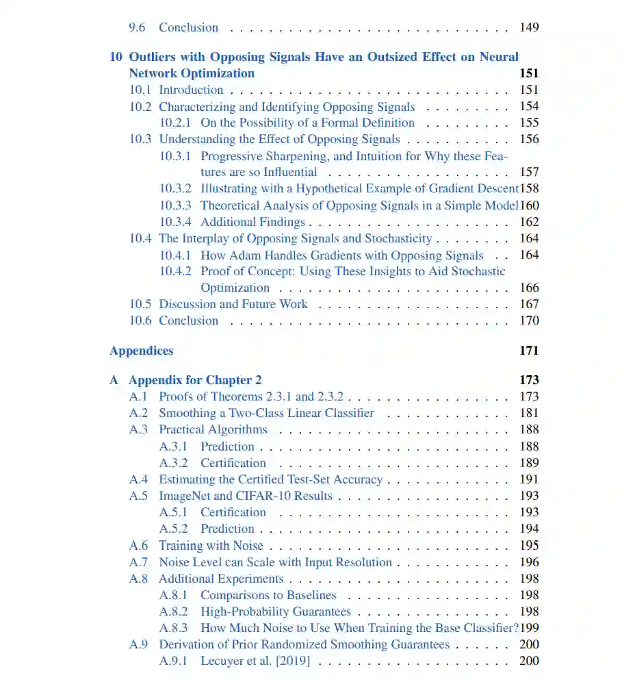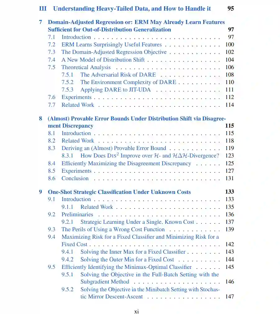 论文的最后一部分广泛探索了更好地理解和利用自然数据中的变化的方法。首先,在第7章中,我们展示了预训练特征足以生成比以前认为的更稳健的预测器。第8章描述了这一发现如何使得使用未标记的测试数据以证明神经网络适时适应变迁,或给出(几乎)有证明的非空的测试误差界成为可能。接下来,第9章开发了一种稳健优化方法用于策略分类,使得双重稳健预测能够优雅地处理策略响应和用户成本函数中的不可避免的不确定性。最后,第10章展示了离群值对神经网络优化的显著影响——这一结果为理解自然数据的重尾如何影响网络行为提供了新的见解,并提出了神经网络优化中各种现象起源的更一致的图景。
