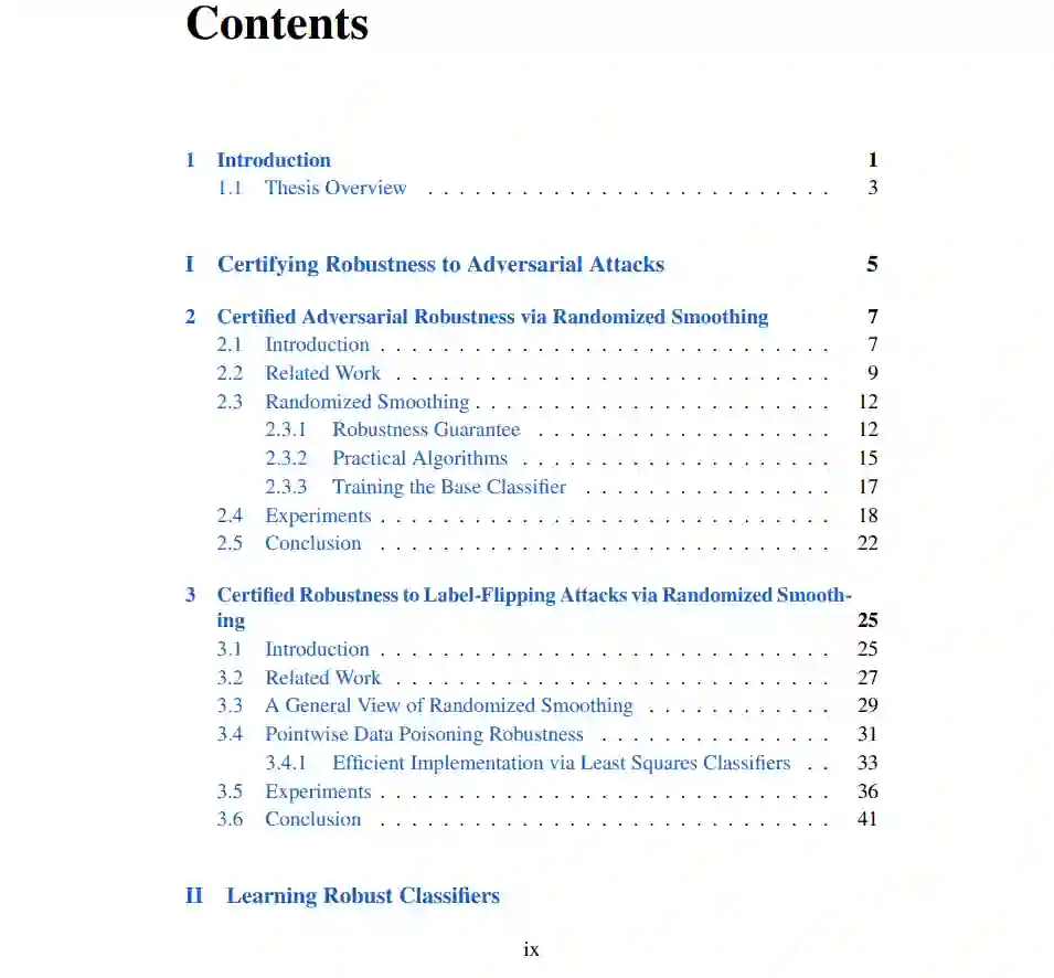 本论文的第一部分描述了大规模认证深度神经网络对抗攻击稳健性的工作。第2章展示了如何将任何在高斯噪声下分类良好的分类器转变为对ℓ2范数下的对抗扰动具有认证稳健性的新分类器。我们证明了使用高斯噪声平滑在ℓ2范数下的紧密稳健性保证,获得了一个在ImageNet上在ℓ2范数小于0.5 (=127/255) 的对抗扰动下具有49%认证top-1准确率的分类器。在第3章中,我们展示了如何使用所提出的方法来认证对更一般的攻击的稳健性,例如对训练数据的对抗性修改,或更一般地说,任何影响模型最终预测的输入。