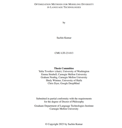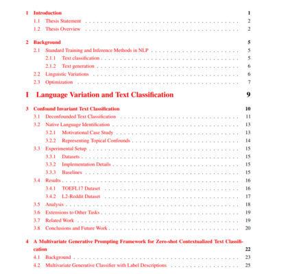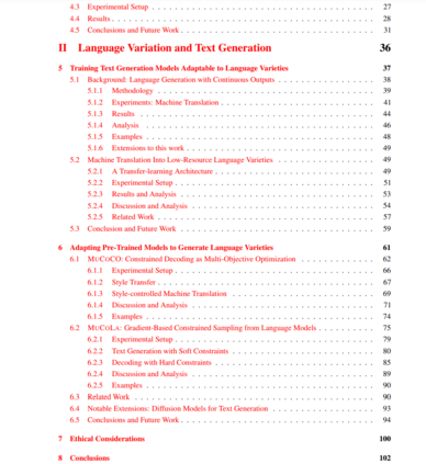 为了实现这一目标,这篇论文专注于重新思考语言理解和生成的标准训练和推理方法的机器学习解决方案。统一的主题是将文本中不同粒度的语言和额外语言多样性整合到ML模型中:从词汇(Kumar和Tsvetkov,2019;Bhat et al.,2019;Kumar et al.,2021a),到句法和风格(Jegadeesan et al.,2021;Kumar et al.,2021b,2022b;Han et al.,2023a),再到语义和语用(Kumar et al.,2023b)。1 我认为,与优化模型参数和输出以达到单一目标(例如最大化任务准确性或生成输入句子的忠实翻译)的传统算法不同,表征NLP中的变异本质上是多目标的。例如,最大化任务准确性和跨说话者变体的公平性;生成忠实翻译并控制特定风格,以及控制语言结构的简单性(或复杂性)。此外,为了促进在广泛实际环境中的使用,这篇论文旨在开发高效解决方案;从计算复杂性,到参数数量,到标记资源的数量。