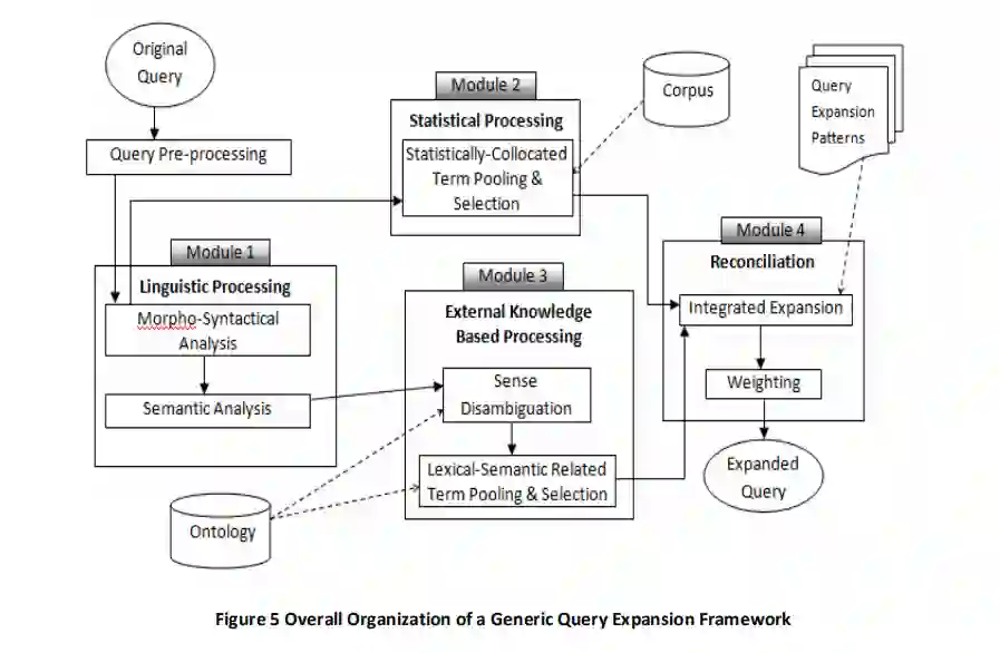 大量知识资源的可用性刺激了开发和增强信息检索技术的大量工作。用户的信息需求以自然语言表达,成功的检索很大程度上取决于预期目的的有效沟通。自然语言查询包含多种语言功能,这些语言功能代表了预期的搜索目标。导致语义歧义和对查询的误解以及其他因素(例如,对搜索环境缺乏了解)的语言特征会影响用户准确表示其信息需求的能力,这是由概念意图差距造成的。后者直接影响返回的搜索结果的相关性,而这可能不会使用户满意,因此是影响信息检索系统有效性的主要问题。我们讨论的核心是通过手动或自动捕获有意义的术语,短语甚至潜在的表示形式来识别表征查询意图及其丰富特征的重要组成部分,以手动或自动捕获它们的预期含义。具体而言,我们讨论了实现丰富化的技术,尤其是那些利用从文档语料库中的术语相关性的统计处理或从诸如本体之类的外部知识源中收集的信息的技术。我们提出了基于通用语言的查询扩展框架的结构,并提出了基于模块的分解,涵盖了来自查询处理,信息检索,计算语言学和本体工程的主题问题。对于每个模块,我们都会根据所使用的技术回顾分类和分析的文献中的最新解决方案。