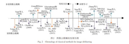 图像模糊是指在图像捕捉或传输过程中,由于镜头或相机运动、光照条件等因素导致图像失去清晰度和细 节,从而影响图像的质量和可用性。为了消除这种影响,图像去模糊技术应运而生。其目的在于通过构建计算机数 学模型来衡量图像的模糊信息,从而自动预测去模糊后的清晰图像。图像去模糊算法的研究发展不仅为计算机视 觉领域的其他任务提供了便利,同时也为生活领域提供了便捷和保障,如安全监控等。1)回顾了整个图像去模糊领 域的发展历程,对盲图像去模糊和非盲图像去模糊中具有影响力的算法进行论述和分析。2)讨论了图像模糊的常 见原因以及去模糊图像的质量评价方法。3)全面阐述了传统方法和基于深度学习方法的基本思想,并针对图像非 盲去模糊和图像盲去模糊两方面的一些文献进行了综述。其中,基于深度学习的方法包括基于卷积神经网络、基于 循环神经网络、基于生成式对抗网络和基于Transformer的方法等。4)简要介绍了图像去模糊领域的常用数据集并 比较分析了一些代表性图像去模糊算法的性能。5)探讨了图像去模糊领域所面临的挑战,并对未来的研究方法进 行了展望。