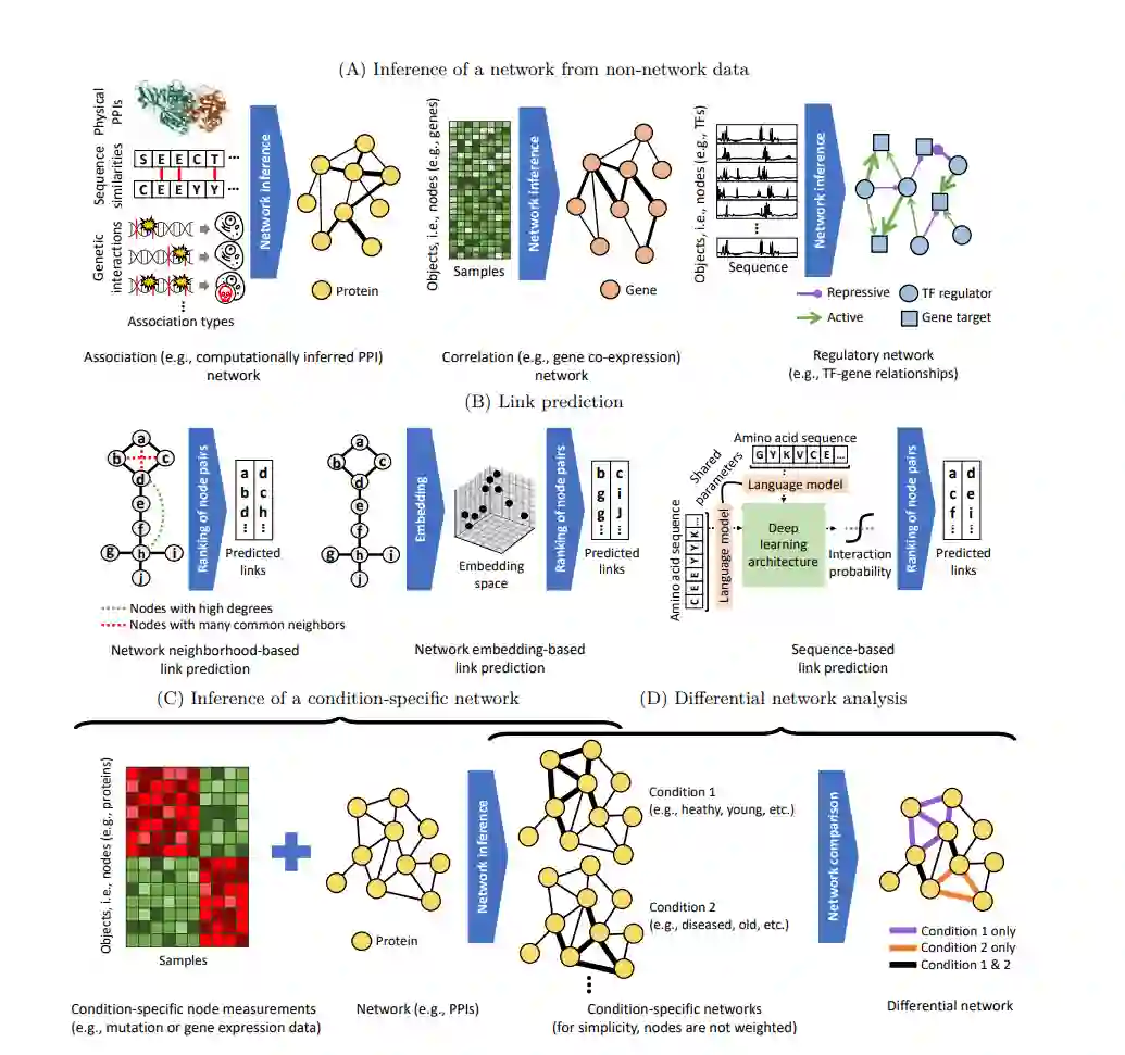 参与者展示了他们对将推动网络生物学中计算和特别是算法进展的重要研究方向、未解决的问题和挑战的看法。演示的视频记录在YouTube1上公开提供,工作坊网站2上还提供了额外的信息。工作坊的一个目标是理解算法领域如何使网络生物学受益,反之亦然。此外,工作坊旨在确定网络生物学中具有挑战性的既定和新兴的以算法为重的主题,这些在图1中有所展示:生物网络的推断和比较(第2节)、多模态数据集成和异构网络(第3节)、高阶网络分析(第4节)、网络上的机器学习(第5节)和基于网络的个性化医学(第6节)。我们评论了为什么这些主题被战略性地选择在工作坊上讨论。 某些类型的-组学数据被明确地作为网络捕获。即,生物分子之间的相互作用作为数据收集的生物技术的结果被明确提供。一个突出的例子是蛋白质-蛋白质相互作用(PPI)网络。在这些网络中,节点是蛋白质,边对应于蛋白质之间的物理结合。在人类和一些模型生物中,大量的高通量酵母杂交和其他实验努力已经导致了大量的“参考”PPIs(例如,人类的HURI),以及大量关于蛋白质结合特异性的知识[245,386]。其他类型的-组学数据不是被明确地作为网络捕获,但生物分子之间的相互作用可以通过计算推断,从而导致例如,关联、相关、调控或知识图(信息框1)。第2节讨论了推断均匀网络的任务的几个方面,包括一个特定条件的网络,通常来自多达几种-组学数据类型/模式,以及差异网络分析的相关主题,这是一种网络比较类型。第3节讨论了推断异构网络的任务,通常来自多种-组学或其他多模态数据类型(信息框1),以及与多-组学数据集成相关的几个其他任务,包括网络对齐,这是另一种网络比较类型。通过均匀网络,我们指的是具有单一节点类型和单一边类型的网络,而通过异构网络,我们指的是任何非均匀网络(即,多个节点类型或多个边类型或两者兼有);详见信息框1和第3节。