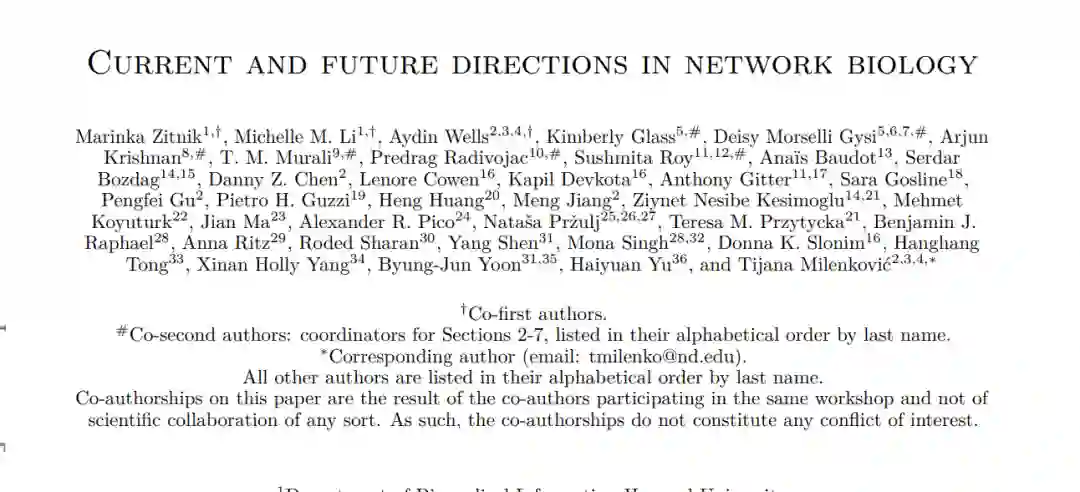五个工作坊主题并非相互排斥。例如,多模态(包括多-组学)数据集成是一个与第2-6节几乎所有相关的主题。在这五个部分中提出当前网络生物学研究的进展之后,第7节讨论了该领域的未来研究方向,第8节对科学社区、教育/培训和计算(包括网络)生物学中的多样性提供了额外的讨论。