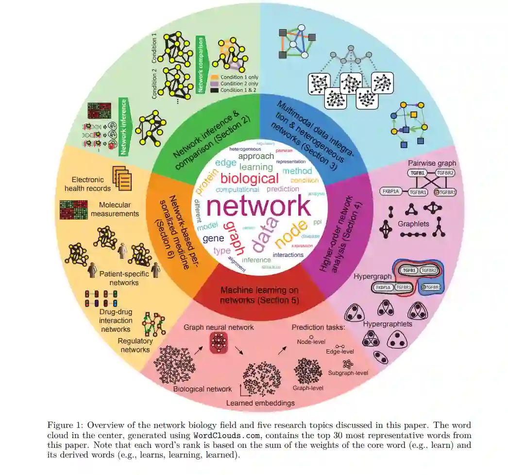 假设已有(明确捕获或推断出的)网络数据,下一步是分析数据。尽管第2节和第3节已经从网络比较和几个其他任务的角度讨论了网络分析,但第4节和第5节进一步讨论了与网络分析相关的突出任务。具体来说,第4节讨论了在传统用于两两图中捕获更高阶网络结构的主题,称为图元(子图),这些图捕获节点对之间的相互作用,以及从两两图转移到超图的主题,这些超图能够捕获两个以上节点之间的相互作用(信息框1)。第5节讨论了网络生物学中的机器学习进展,这是一个领域,在过去的十年中已经呈指数增长。讨论的关键主题包括图表示学习、将知识整合到机器学习模型中、生成图模型和迁移学习。第6节通过讨论网络生物学的应用方面来补充其他以计算为中心的部分:基于网络的个性化(或精确)医学。精确医学旨在为个体提供量身定制的治疗策略[13,192]。这种个性化的特征可能包括分子、环境、生活方式和其他因素。通过网络方法整合这些不同的数据类型可以扩大精确治疗的潜力,同时对各种类型的数据噪声提供稳健性[425]。