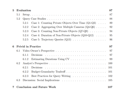 随着摄像机在公共场所的普及和计算机视觉技术的准确性变得司空见惯,人们对从这些摄像机收集和处理数据的兴趣越来越大(称为“视频分析”)。尽管这些趋势支持了许多有用的应用(例如,监测汽车和行人的移动模式以提高道路安全性),但它们也在前所未有的程度上开启了对人们的详细监视。以前的解决方案并未实际解决效用与隐私之间的这种紧张关系,因为它们依赖于每一帧视频中所有私有信息的完美检测——这是一个不切实际的假设。在这篇论文中,我们介绍了Privid,一个隐私保护的视频分析系统,旨在提供隐私的有意义保证和一个适用于广泛分析师的表达、通用的查询界面。特别是,Privid的隐私定义不需要完美检测私有信息,其查询界面允许分析师提供他们自己的任意(不受信任的)机器学习(ML)处理模型。从我们的评估中得出的关键结论是,Privid可以在隐私和实用性之间提供一个实际的平衡:在对真实的监控视频和模拟的城市范围摄像头网络进行的各种查询中,Privid以差分隐私保护了所有人的外貌,并维持了相对于非隐私系统79-99%的准确率。
