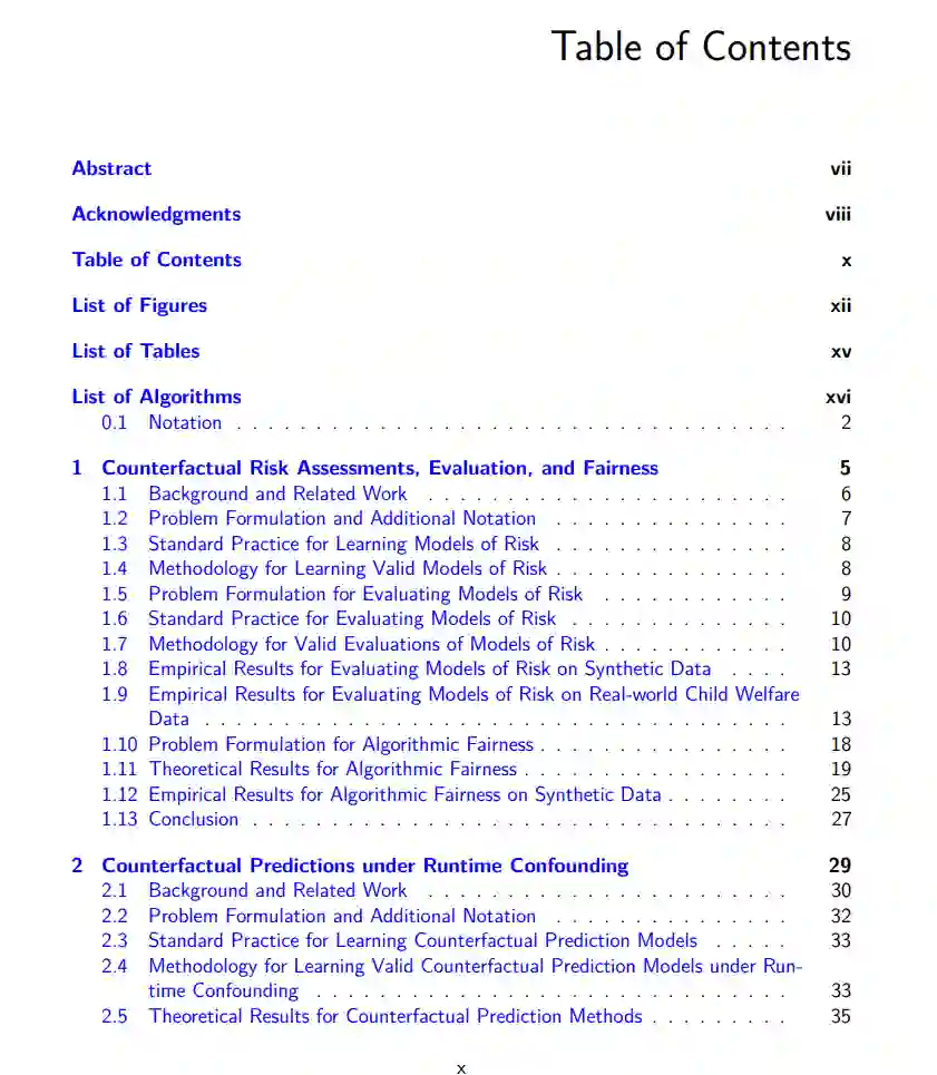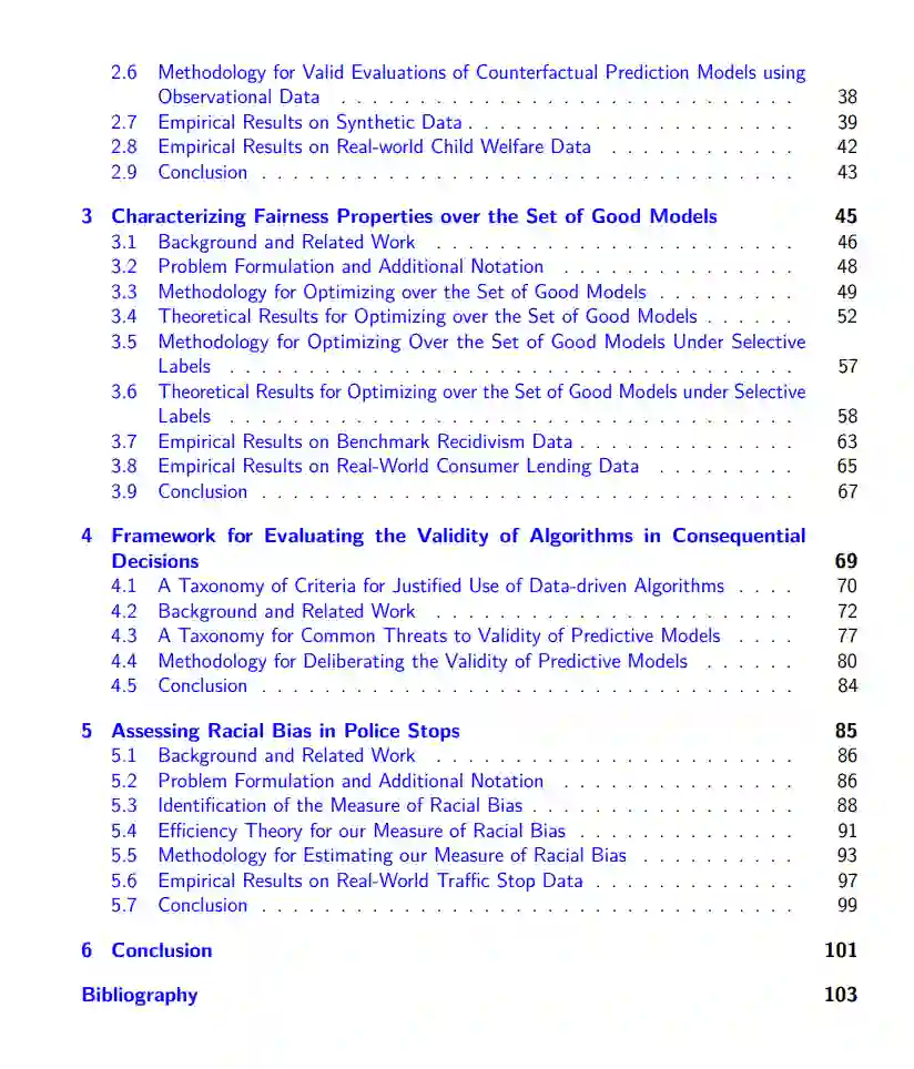 我们在§ 0.1中描述了问题设定和符号。接下来的三个部分考虑在缺失数据的性质不同假设下如何获得有效的预测、评估和公平性评估。§ 1描述了当我们已经测量了所有共同影响决策和感兴趣结果的混淆因素时的方法。在许多决策支持环境中,混淆因素可能难以在运行时测量并输入到预测模型中,但在离线数据集中可能仍然可用于训练和评估。§ 2为这种“运行时混淆”设置提供了方法。§ 3通过拉舍蒙效应的视角深入研究公平和公正的问题,拉舍蒙效应是一种实证现象,即多种模型在总体上达到可比较的好的表现,但在个别预测上却明显不同。§ 4描述了一个框架,用于在算法设计中审查有效性,并最终决定是否在高风险环境中部署一个工具。扩大我们的范围到算法被训练和使用的更广泛的背景中,§ 5提出了一个对刑事司法系统中人类决策的种族偏见进行回顾性统计审计的方法。我们在本节提出的方法也展示了如何在对社会有重大影响的领域使用机器学习来评估这些系统以及在其中行使权力的行动者。我们将本论文中提出的工作与我们的三个指导原则:有效性、公平性和治理,联系起来。
