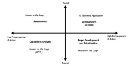 风险将推动军队应该在哪里实施人工智能以及系统应该有多大的自主性。麻省理工学院(MIT)林肯实验室提出了一个描述人工智能 "影响领域"的模型,它试图定义人工智能的现有商业和军事应用。在这个模型中,低行动后果的应用包括将人工智能用于机器人吸尘器,而高行动后果的应用则将生命置于危险之中,如医疗诊断。这个模型将人工智能投资放在不同级别的可用数据和行动后果的类别中。例如,根据这个模型,最初投资于人工智能来分析ISR图像的行动后果低于使用人工智能来直接攻击目标。同样的数据可以为ISR探测和武器交战提供信息,但显然行动的后果随着交战而增加。