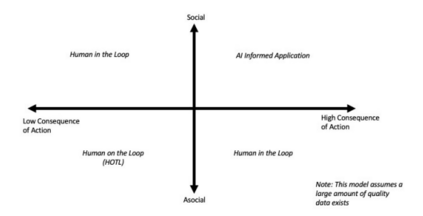 正如李开复和麻省理工学院林肯实验室所强调的数据重要性,组合模型的第一步需要策划大量的高质量、有标签的数据。必要的数据和对现有系统的完整理解只意味着人工智能可能会发挥作用。其他重要的技术考虑因素比比皆是,包括但不限于计算的可操作性、优化描述的精确性,以及学习模型的适用性。除了技术上的考虑,其他的标准也告知人们是否应该使用人工智能。使用的行动后果和社会方面的双轴分析来评估应该如何使用人工智能,而不是是否可以。对人工智能应用的完整评估需要审查数据的可用性和人工智能的技术适用性,然后评估社会和行动的后果要素。