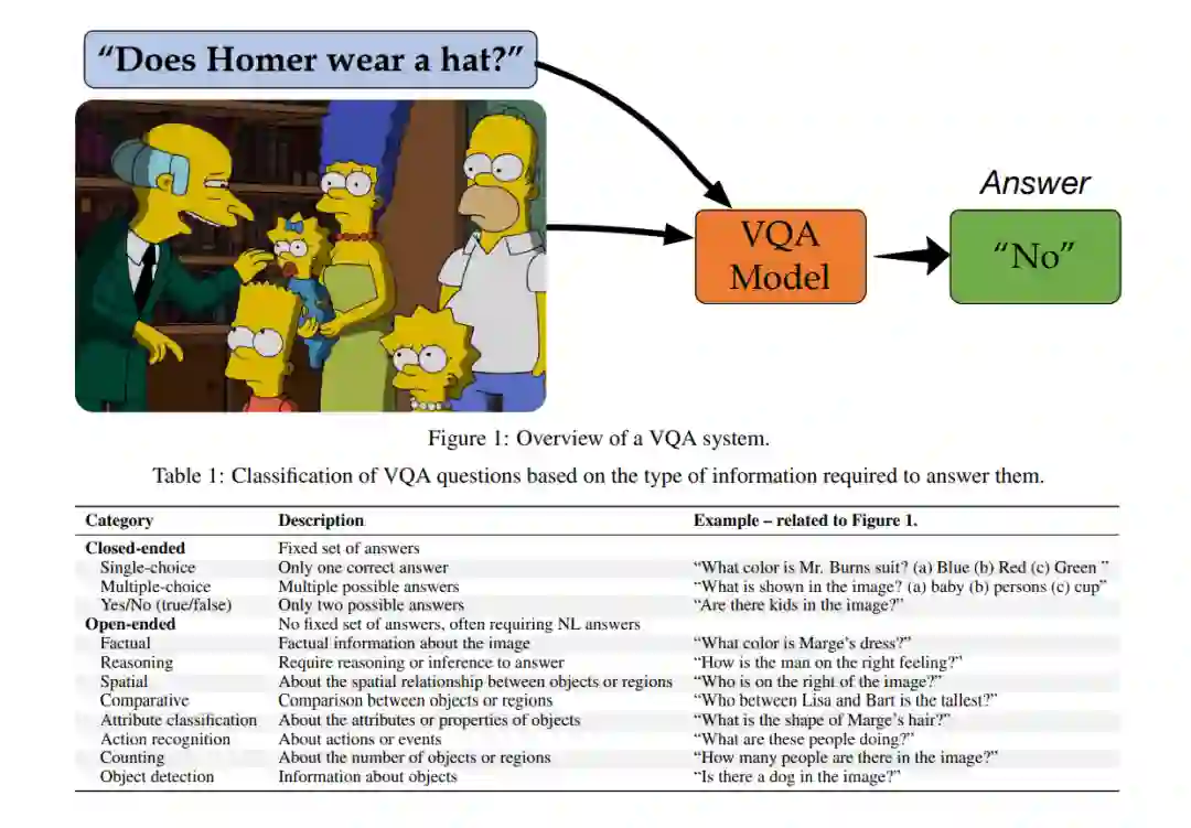 人类能够通过各种感官模态(如听觉、嗅觉、视觉和触觉)处理来自周围环境的信息。尽管这些类型的数据是单独吸收的且不兼容,但人类具有显著的能力来对齐和融合它们,以更好地感知和理解周围的世界。例如,当观看电视节目时,人类可以同时处理节目的视觉和听觉组件,以增强对内容的理解和享受。这种不同感官模态的整合对于我们作为人类有效感知和解释世界的能力至关重要,并突显了人脑的惊人灵活性和适应性。 多模态计算是一个吸引了研究界广泛关注的领域,旨在通过在机器中开发能够整合来自多个来源(如图像、音频和文本)信息的算法来复制这种能力。通过使机器能够处理来自不同模态的信息,多模态计算可以增强它们以更类似人类的方式理解和与世界互动的能力。这种方法为创建能够实现计算机以前无法实现的新能力的先进算法铺平了道路。例如,计算机现在可以找出图像中哪个对象与文本查询最相关。这种不同感官模态的整合对于开发更智能和直观的机器至关重要,并有可能改变许多行业,从医疗保健到娱乐。 视觉问答(VQA)是多模态视觉语言(VL)任务的一个例子,它结合了计算机视觉和自然语言处理技术,使机器能够回答关于视觉内容的问题。例如,如图 1 所示,给定一张“辛普森一家”电视节目的图像和一个自然语言问题,如“霍默戴帽子了吗?”,VQA 系统应该能够识别图像中的“霍默”并生成正确答案“否”。在各种大规模数据集的支持下,VQA 任务在多种应用中取得了显著进展,包括创建交互式教育工具、诊断医学图像、辅助客户服务、增强娱乐体验和生成社交媒体内容的标题。VQA 被广泛认为是 VL 计算领域中最具挑战性的任务之一,特别是与其他 VL 任务(如视觉定位和视觉字幕生成)相比。其中一个原因是 VQA 的输入问题形式比其他 VL 任务更加多样化。虽然其他任务(如视觉定位)中的文本查询是固定的,并描述图像中的特定对象或特征,但 VQA 问题在格式和内容上可以有很大的差异。表 1 提供了按各自 AI 问题领域组织的 VQA 问题示例,我们观察到 VQA 可以解决广泛的 AI 问题,包括图像分类、目标检测、计数、场景分类、属性分类、活动识别和推理理解。
