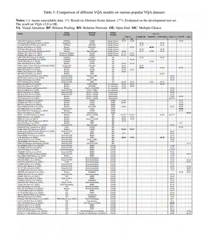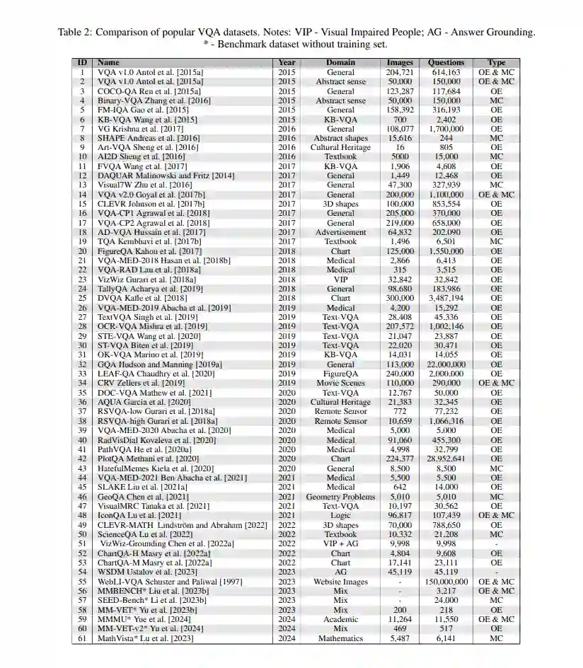 VQA 代表了人工智能领域的重大进展,使机器能够解释和回应关于视觉内容的问题。多年来,VQA 已经从简单的基于图像的问题回答系统发展到能够进行复杂推理的复杂模型,这些模型基于视觉和语言理解。 本综述的关键要点是 VQA 在各个领域的多功能性。从医学诊断和教育工具到视障人士的可访问性,VQA 的应用广泛且具有影响力。然而,挑战仍然存在,如需要领域特定的数据集、增强的推理能力和实时系统性能。 展望未来,LVLMs 的整合有潜力将 VQA 推向新的领域,提高准确性并扩展到更多样化和复杂的任务。随着 VQA 的不断发展,解决数据集可用性、计算效率和实际部署方面的差距将是实现其全部潜力的关键。