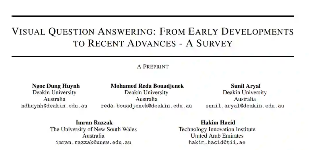 近年来,已经发表了几篇关于 VQA 的综述论文,以回顾和评估 VQA 的不同方面(例如,Zhang 等人(2019);Kallooriyakath 等人(2020);Manmadhan 和 Kovoor(2020);Zou 和 Xie(2020);Sharma 和 Jalal(2021))。特别是,Zhang 等人(2019)和 Kallooriyakath 等人(2020)专注于回顾现有的融合技术,而 Manmadhan 和 Kovoor(2020)提供了 VQA 的全面视图,涵盖了视觉编码器、语言编码器、融合策略、数据集和评估指标。Zou 和 Xie(2020)回顾了可用的 VQA 数据集及其局限性。Sharma 和 Jalal(2021)将他们的综述扩展到传统 VQA 模型之外,并包括文本 VQA 和基于知识的 VQA。 然而,随着该领域的快速发展,结合新技术、模型和数据集的引入,我们认为有必要对该主题进行最新和全面的综述。首先,上述综述仅关注 VQA 的特定方面,如融合技术或数据集,并未提供该领域的全面视图。其次,随着 LVLM(视觉语言预训练)模型(如 ViLBERT(Lu 等人,2019)、VisualBERT(Li 等人,2019a)和 VL-BERT(Su 等人,2019))的引入,VQA 模型取得了显著进展。这些模型在大量图像和语言数据上进行预训练,以学习视觉和语言的联合表示,然后在视觉语言任务(如 VQA)上进行微调。通过这样做,这些模型显著提高了 VQA 任务的准确性。据我们所知,这些模型尚未在任何现有综述中得到回顾。第三,VQA 已应用于医疗保健、教育和客户服务等不同领域,这些领域具有独特的挑战,需要特定的解决方案。最后,VQA 的实际应用已扩展到更复杂的任务,如多模态对话系统和开放域 VQA,这些任务需要与传统 VQA 不同的方法。因此,有必要对 VQA 进行新的综述,涵盖最新进展、实际应用和新兴趋势,为研究人员和实践者提供该领域的全面概述。 本文的其余部分组织如下:首先,第 2 节介绍了我们在本文中讨论的 VQA 任务,并基于视觉编码器、语言编码器以及融合图像和问题特征以生成答案的技术(包括 LVLM 模型)提出了 VQA 系统的分类法。接下来,第 4 节探讨了 VQA 研究中最广泛使用的一些数据集。然后,第 6 节讨论了 VQA 模型最常用的评估指标。第 7 节概述了 VQA 在医学成像、视障人士、文化遗产、广告和教育等领域的各种实际应用。第 8 节基于准确性分析和比较了现有的 VQA 模型,并提出了构建 VQA 模型和实际 VQA 应用的未来工作方向。最后,第 9 节总结了本文。