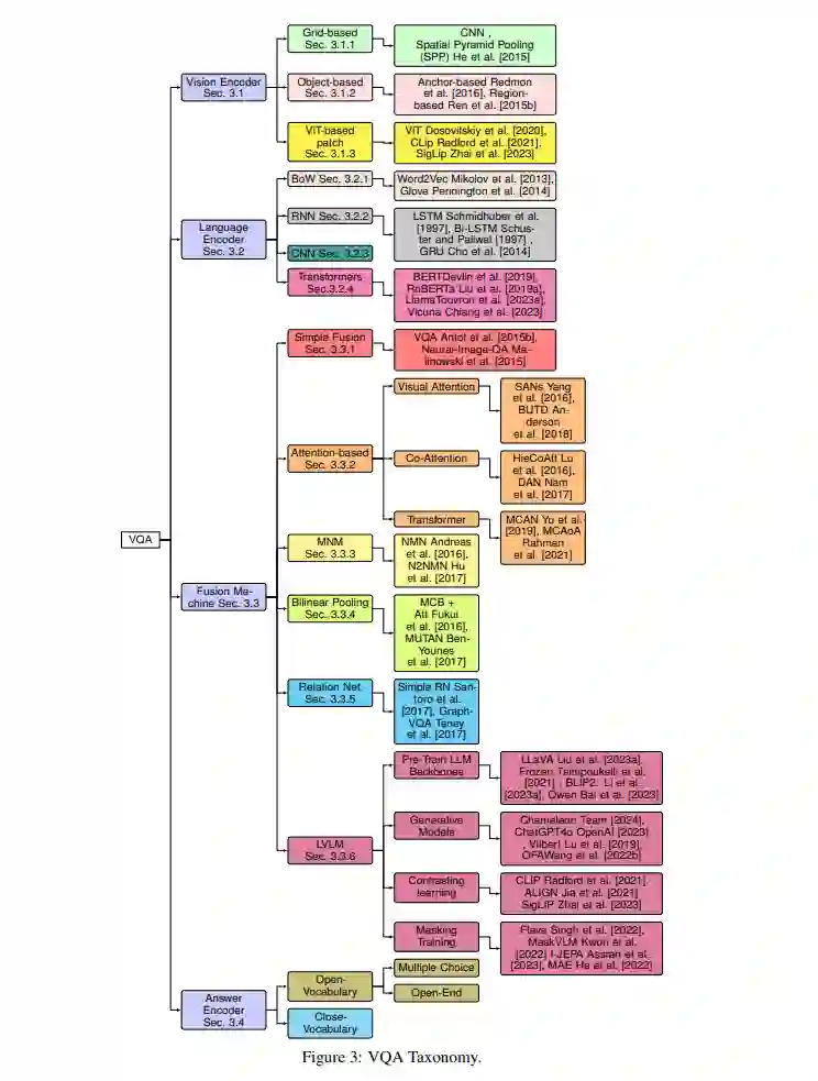 如图 2 所示,典型的 VQA 系统通常由三个阶段组成:特征提取、融合和答案解码器。前两个步骤分别涉及从输入图像和问题中提取视觉特征和文本表示。视觉编码器负责使用计算机视觉技术(如 CNN、视觉 Transformer 等)从图像中提取视觉特征。另一方面,语言编码器使用自然语言处理(NLP)技术(如 RNN、Transformer 等)从输入问题中提取文本表示。关于这两个编码器的更多详细信息可以在第 3.1 节和第 3.2 节中找到。然后,图像和语言编码器的输出向量通过融合组件进行组合,使用诸如逐元素乘积或连接等技术(Antol 等人,2015b)。生成的融合向量随后通过答案解码器生成给定问题的答案。有关此过程的更多信息可以在第 3.3 节中找到。通过使用此框架,VQA 系统可以处理各种问题和图像,使其适用于不同的场景。 在以下小节中,我们将介绍在操作 VQA 系统时涉及的每个步骤中使用的主要技术。这些技术也在图 3 所示的通用分类法中进行了总结。