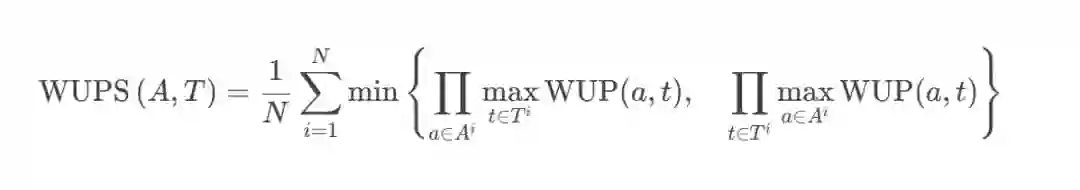 Wu-Palmer 相似性(WUP)是 WordNet 词汇数据库中两个单词或概念之间语义相似性的度量(Miller,1995),WordNet 是一个大型英语词汇数据库,将单词分组为同义词集(synsets)并描述它们之间的语义关系。WUP 计算两个概念之间的相似性,作为 WordNet 层次结构中最小公共子节点的深度除以两个概念的深度之和。WUP 得分在 [0, 1] 范围内,值越大表示两个单词的相似性越高。例如,(dog, puppy)的 WUP 得分为 0.9677。同时,(tall, short)的 WUPS 得分为 0.3102。在此指标下,与标签语义更相似的答案将受到较少的惩罚。基于 WUP,WUP 集得分(WUPS)(Malinowski 和 Fritz,2014)定义如下: