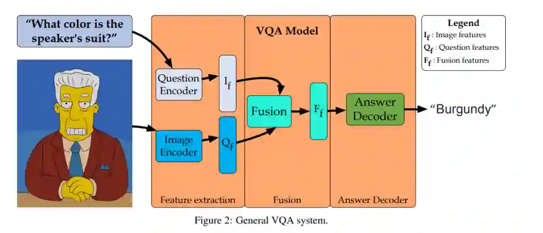 VQA 是由 Antol 等人(2015b)首次引入的任务,是人工智能中的一项任务,涉及回答关于图像的自然语言问题。它要求系统具有广泛的知识,并能够对图像内容进行推理以提供准确的答案。VQA 系统通常由四个主要组件组成:视觉编码器、语言编码器、融合机和答案解码器(如图 2 所示)。在本节中,第 3.1 和 3.2 小节包括用于提取图像表示和问题表示的技术。第 3.3 小节包括用于组合图像和问题表示的模型的分类法。最后,答案解码器在第 3.4 小节中讨论。 本部分的组织遵循图 2 中描述的操作 VQA 系统的三个主要步骤:图像和问题特征提取分别在 3.1 和 3.2 节中,融合在 3.3 节中,答案解码器在 3.4 节中。