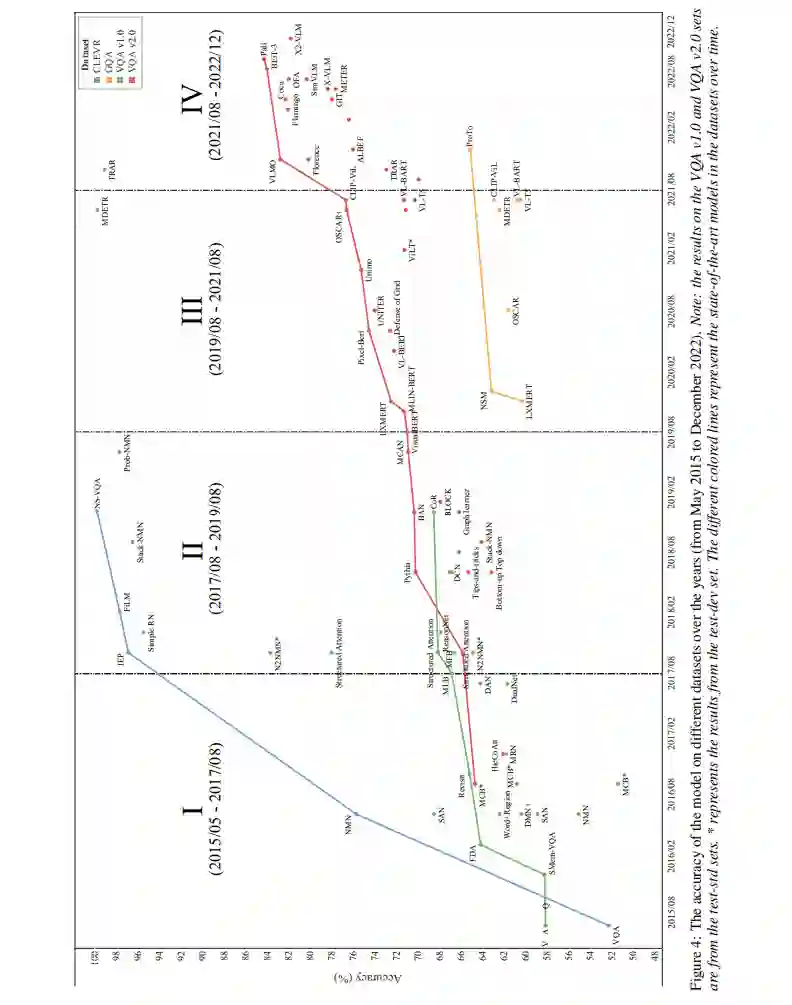 大多数研究人员专注于改进这一部分,而不是其他部分。因此,融合方法的发展非常多样化。图 4 展示了从 2015 年至今的 VQA 模型以及其他模型的最新技术水平。 第一时期: 最初,RNN-CNN 后跟简单的融合操作用于构建 VQA 模型。这种端到端方法简单,达到了较低的性能(Antol 等人,2015b)。从 2015 年到 2017 年,提出了基于视觉的模型,使用注意力机制权衡图像不同区域和输入问题的贡献。因此,基于视觉注意力的模型优于之前的工作(Yang 等人,2016;Ren 等人,2015a)。同时,引入了一些双线性池化融合技术,并取得了更好的结果,因为它们可以捕获图像和问题特征之间的交互(Fukui 等人,2016;Kim 等人,2016b;Yu 等人,2017;Ben-Younes 等人,2017)。此外,Fukui 等人(2016)将这些池化技术集成到基于注意力的模型中,以提高 VQA 性能。除了这些方法外,关系网络(Santoro 等人,2017;Teney 等人,2017)和 NMN 模型(Andreas 等人,2016;Hu 等人,2017;Johnson 等人,2017a)也取得了一定的成就。这一时期在 VQA v1.0 数据集上的准确性范围为 58% 到 64%。 第二时期: 提出了共同注意力机制以同时捕获视觉和问题注意力(Nguyen 和 Okatani,2018;Yu 等人,2018;Nam 等人,2017)。然而,Yu 等人(2019)建议这些共同注意力模型仅限于捕获问题的单词到单词关系和图像的区域到区域关系。因此,他们使用 Transformer 构建了 MCAN(Yu 等人,2019)。在 VQA v1.0 和 v2.0 上的性能从 66% 到 71%。 第三时期: 提出了一些基于 Transformer 的 VQA 模型(Yu 等人,2019;Zhou 等人,2021;Zhao 等人,2021)。然而,LVLM 出现并成为解决 VQA 以及其他 VL 任务(如视觉字幕生成)的主要主题。最初,LVLM 模型使用基于对象的视觉编码器进行视觉编码(Li 等人,2019a;Su 等人,2019;Chen 等人,2020;Li 等人,2020a;Zhang 等人,2021;Cho 等人,2021;Lu 等人,2019;Tan 和 Bansal,2019;Yu 等人,2021)。后来,研究人员将其替换为基于网格和基于 ViT 的补丁编码器,以构建端到端的 LVLM 模型(Kim 等人,2021;Huang 等人,2020;Shen 等人,2021;Kamath 等人,2021;Li 等人,2021)。在这一时期,这些模型的规模通常是中等规模的,例如 ALIGN 有 8.2 亿参数,Florence 有 8.93 亿参数。在 VQA v2.0 上的准确性范围为 71% 到 78%。 第四时期: LVLMs 继续主导解决视觉语言任务(包括 VQA)的领域。最近的进展看到了来自领先公司(如 Google、Microsoft 和 DeepMind)的高度扩展的 LVLMs 的引入。这些模型的规模从几十亿到几百亿参数不等,如 PaLI(Wang 等人,2022d)有 169 亿参数,Flamingo 有 802 亿参数。这些模型在 VQA v2.0 基准测试中的准确性范围为 78% 到 84%。 未来,这些 LVLMs 有望显著增强零样本和少样本学习能力,减少对广泛微调的需求。通过利用这些大规模模型中编码的丰富知识,未来的迭代可能会在跨任务和领域泛化方面表现出色,只需最少的额外训练即可执行新任务并回答复杂查询,从而简化这些模型在各种实际应用中的部署。事实上,原始 VQA 模型的构建已被 LVLM 取代,因为 LVLM 可以同时解决许多任务,并在 VL 任务中取得高结果。LVLM 将继续是一个热门领域,吸引未来研究人员的关注。
