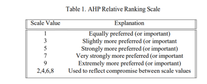 AHP是托马斯-萨蒂(Thomas Saaty)于1987年提出的一种方法,它利用专家判断得出的一系列成对比较,将功能层次结构中的每个功能和子功能放入一个优先级表中。然后通过有形数据或专家定性意见对各种属性进行排序。如表1所示,这些排序被置于1-9的范围内。在赋予每个属性1-9的权重后,再赋予标准和次级标准权重,以显示其相对重要性(Saaty,1987)。