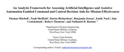 美国陆军目前正在开发将人工智能和辅助自动化(AI/AA)技术融入作战空间的决策辅助系统。据美国陆军机动中心称,在决策辅助系统等人工智能/辅助自动化系统的协助下,士兵的作战效率可提高10倍(Aliotta,2022年)。决策辅助工具旨在协助指挥官在作战场景中减少决策时间,同时提高决策质量和任务效率(Shaneman, George, & Busart, 2022);这些工具有助于整理作战数据流,协助指挥官进行战场感知,帮助他们做出明智的实时决策。与使用AI/AA决策辅助工具相关的一个问题是,陆军目前缺乏一个有效的框架来评估工具在作战环境中的使用情况。因此,在本文中,我们将介绍我们对分析框架的研究、设计和开发,并结合建模和仿真来评估AI/AA决策辅助工具在指挥和控制任务中的有效性。