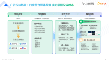 接下来以广告投放场景为例,展示我们整个数据工作流。我们的外部数据源包括抖音快手百度腾讯,通过监测连接去获取这些外部数据。内部数据包括用户数据和业务数据。接下来通过快速的连接组件同步工具,达到一键可视化的效果。此外,更高阶的自主探索分析,比如广告的展示点位是否会影响投放效果,保费理赔情况等也是我们关注的。