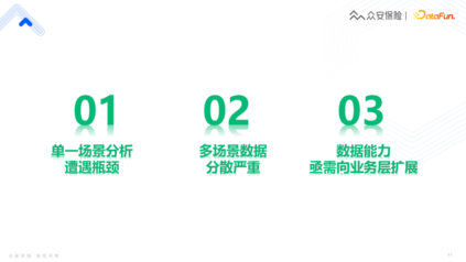 第三件事情是模式,我们希望通过算法模型和基建大数据去做模式的创新。 比如流程创新,目前我们的大部分理赔可以在短时间内完成,没有人工介入,这个过程就涉及到了很多AI算法模型和实时计算,比如特征选取、反欺诈外部数据调用、模型判断、理赔规则生成等。这里并非强调我们的算法模型的超高准确性,或者数据处理量级的高度,而是我们通过实时计算、模型算法等技术去创新理赔业务流程,使得这个流程变得更加的迅速,让用户有最佳的体验。 在产品创新上,比如我们想做宠物险这一产品,就是对宠物的保障,那我们要怎么确定理赔发生时的宠物是当时保的宠物?这里面的反欺诈风险其实非常高,那怎样去做这类保险产品的创新,也是一个待解答的问题。最后是模式上的创新,整个众安的数据团队都在不懈努力的去做了这样一件事。 今天主要和大家分享最基础的运营侧,虽然基础,但是它实际上占据了整个公司运转当中非常重要的部分。接下来我将从运营的角度去介绍我们数据应用情况。 3. 众安数据中台介绍