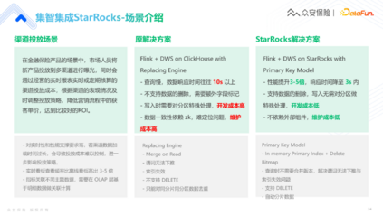 在广告投放场景中,实时性的要求非常高,数据链路较为复杂,可能包含七八个节点。 以往通过clickHouse加上Replacing Engine进行查询时,需要10s以上的响应时间。此时,业务同学会有抱怨,有时可能需要暂停业务动作,等数据出来再去推进工作。 之后我们选择了Flink on StarRocks的架构,结合众安的集智平台,性能提升了3-5倍。 今天主要和大家分享了,众安数据团队如何通过更精细化、更快速高效的的报表分析系统搭配引擎,解决运营当中的数据分析问题。