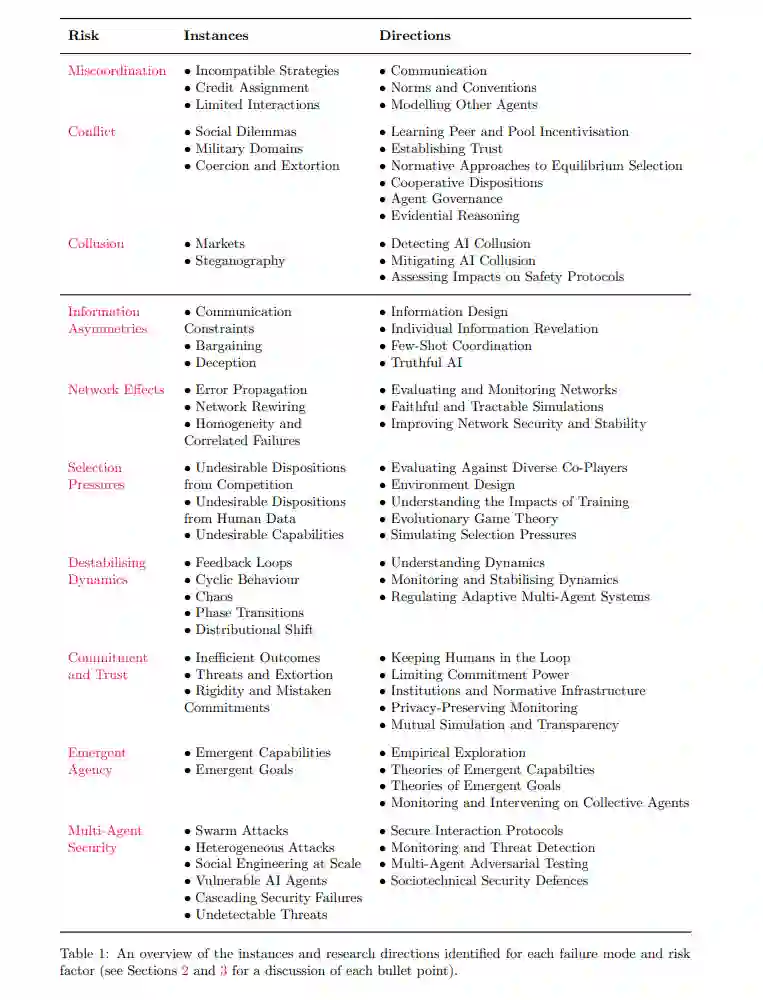 为了支持这些建议,我们提出了一种新的风险分类法,专门针对在多智能体环境中表现为新的、更加具有挑战性或本质上不同的人工智能风险,并提供了初步的缓解方案评估。我们识别了三种高层次的失败模式,这些模式取决于代理目标的性质和系统预期行为:协调失误、冲突和合谋。然后,我们描述了七个可能导致这些失败的关键风险因素:信息不对称、网络效应、选择压力、破坏性动态、承诺与信任、涌现代理和多智能体安全。针对每个问题,我们提供了定义、关键实例、案例研究和未来工作的有前景方向。最后,我们讨论了这些问题对现有人工智能安全、治理和伦理工作的影响。 1. 引言
