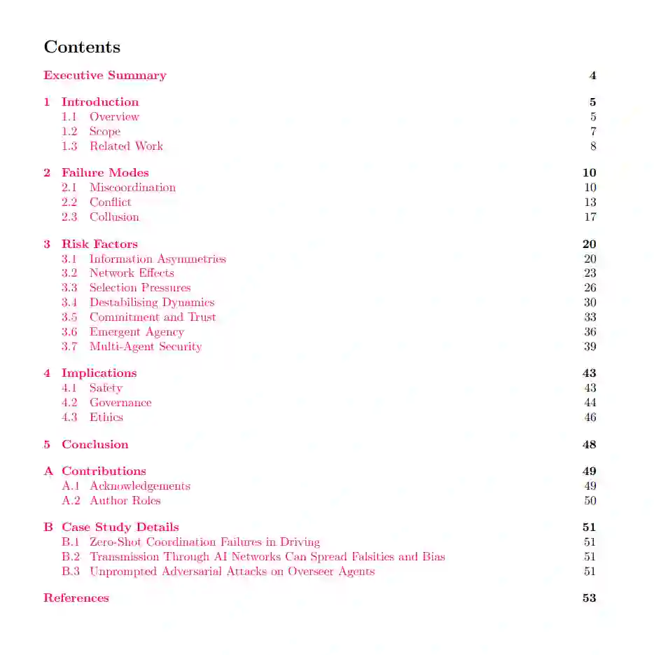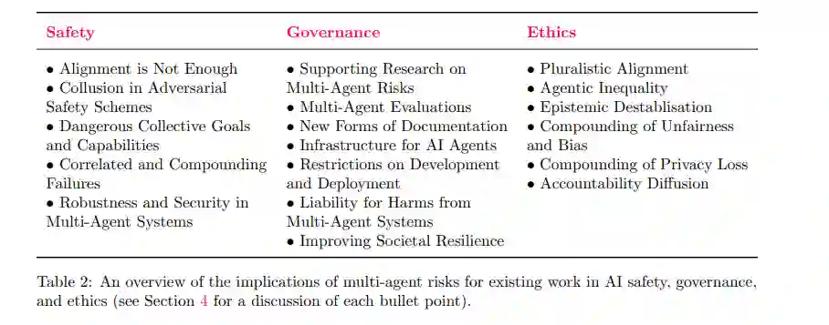 最后,我们将讨论这些风险在人工智能安全(第4.1节)、人工智能治理(第4.2节)和人工智能伦理(第4.3节)方面的影响。例如,大多数人工智能安全研究(第4.1节)关注的是单一系统的稳健性、可解释性或对齐等问题(Amodei et al., 2016;Anwar et al., 2024;Hendrycks et al., 2021),尽管越来越多的关于构建更安全人工智能系统的建议实际上是隐含多智能体的(例如,Drexler, 2019;Greenblatt et al., 2023;Irving et al., 2018;Perez et al., 2022a;Schwettmann et al., 2023)。人工智能治理(第4.2节)方面的努力通常涉及多利益相关者环境,这为治理工具与技术进展的结合提供了希望,从而缓解多智能体风险(Reuel et al., 2024a;Trager et al., 2023)。同时,多智能体交互自然引发了人工智能伦理(第4.3节)中的公平性、集体责任和社会利益等问题(Friedenberg & Halpern, 2019;Gabriel et al., 2024;Zhang & Shah, 2014a)。