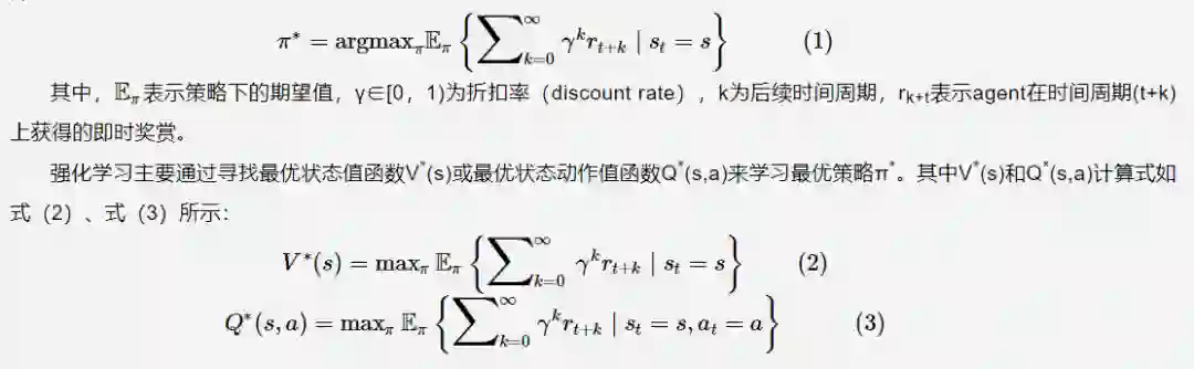 agent从环境中感知当前状态st,从动作空间A中选择能够获取的动作at;执行at后,环境给agent相应的奖赏信号反馈 rt+1,环境以一定概率转移到新的状态st+1,等待agent做出下一步决策。在与环境的交互过程中,agent有两处不确定性,一处是在状态 s 处选择什么样的动作,用策略π(a|s)表示agent的某个策略;另一处则是环境本身产生的状态转移概率Pass′,强化学习的目标是找到一个最优策略π*,使得它在任意状态s和任意时间步骤t都能够获得最大的长期累计奖赏,即: