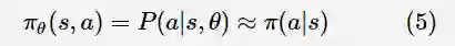 在基于策略的强化学习方法中,主要采用类似的思路,只不过主要对策略进行近似表示。此时,策略可以被描述为一个包含参数θ的函数,θ主要为神经网络中的权重,即式(5):