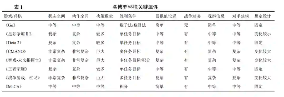 国内游戏 AI 领域取得了标志性的进步。腾讯《王者荣耀》的《觉悟AI》作为一款策略对抗游戏取得了显著成绩,可以击败97%的玩家,并且多次击败顶尖职业团队[6]。网易伏羲人工智能实验室在很多游戏环境都进行了强化学习游戏 AI 的尝试[6],如《潮人篮球》《逆水寒》《倩女幽魂》。超参数科技(深圳)有限公司打造了游戏AI平台“Delta”,集成机器学习、强化学习、大系统工程等技术,通过将AI与游戏场景结合,提供人工智能解决方案[7]。启元AI“星际指挥官”在与职业选手的对抗中也取得了胜利[8]。北京字节跳动科技有限公司也收购了上海沐瞳科技有限公司和北京深极智能科技有限公司,准备在游戏AI领域发力。除了游戏AI领域,国内在智能兵棋推演领域也发展迅速。国防大学兵棋团队研制了战略、战役级兵棋系统,并分析了将人工智能特别是深度学习技术运用在兵棋系统上需要解决的问题[9]。中国科学院自动化研究所在2017年首次推出《CASIA-先知1.0》兵棋推演人机对抗AI[10],并在近期上线“庙算·智胜”即时策略人机对抗平台[11]。此外,由中国指挥与控制学会和北京华戍防务技术有限公司共同推出的专业级兵棋《智戎·未来指挥官》在第三届、第四届全国兵棋推演大赛中成为官方指定平台。中国电科认知与智能技术重点实验室开发了MaCA智能博弈平台,也成功以此平台为基础举办了相关智能博弈赛事。南京大学、中国人民解放军陆军工程大学、中国电子科技集团公司第五十二研究所等相关单位也开发研制了具有自主知识产权的兵棋推演系统[12,13,14,15]。2020年,国内举办了4次大型智能兵棋推演比赛,这些比赛对于国内智能博弈推演的发展、作战推演领域的推进具有积极影响。游戏 AI 和智能兵棋的发展也逐渐获得了国内学者的关注,胡晓峰等人[5]提出了从游戏博弈到作战指挥的决策差异,分析了将现有主流人工智能技术应用到战争对抗过程中的局限性。南京理工大学张振、李琛等人利用PPO、A3C算法实现了简易环境下的智能兵棋推演,取得了较好的智能性[16-17]。中国人民解放军陆军工程大学程恺、张可等人利用知识驱动及遗传模糊算法等提高了兵棋推演的智能性[18-19]。中国人民解放军海军研究院和中国科学院自动化研究所分别设计和开发了智能博弈对抗系统,对于国内智能兵棋推演系统的开发具有重要参考价值[20]。中国人民解放军国防科技大学刘忠教授团队利用深度强化学习技术在《墨子•未来指挥官系统》中进行了一系列智能博弈的研究,取得了突出的成果[21]。中国科学院大学人工智能学院倪晚成团队提出一种基于深度神经网络从复盘数据中学习战术机动策略模型的方法,对于智能博弈中的态势认知研究具有重要参考价值[22]。