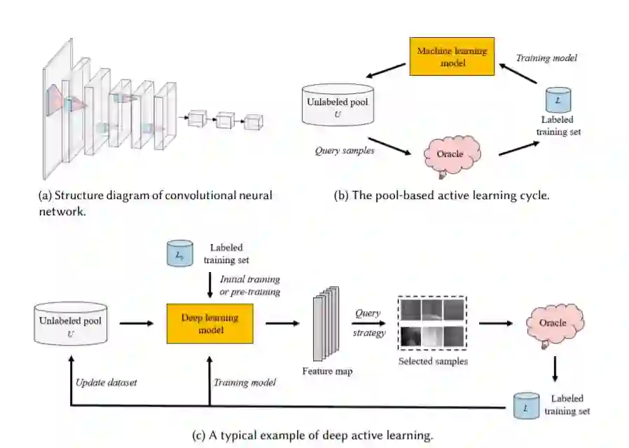 图1所示。DL、AL和DAL的典型体系结构比较。(a)一种常见的DL模型:卷积神经网络。(b) 基于池化的AL框架: 使用查询策略查询未标记的样本池U和将其交给oracle进行标注,然后将查询样本添加到标记的训练数据集L,然后使用新学到的知识查询的下一轮。重复此过程,直到标签预算耗尽或达到预定义的终止条件。(c) DAL的一个典型例子:在标签训练集L0上初始化或预训练DL模型的参数的常变量,利用未标记池U的样本通过DL模型提取特征。然后根据相应的查询策略选择样本,在查询时对标签进行查询,形成新的标签训练集L,然后在L上训练DL模型,同时更新U。重复此过程,直到标签预算耗尽或达到预定义的终止条件。