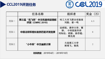 “第十八届中国计算语言学大会” (The Eighteenth China National Conference on Computational Linguistics, CCL 2019)技术评测共包括 三个评测任务:第三届“讯飞杯”中文机器阅读理解评测(CMRC 2019)、CCL “小牛杯”幽默计算评测、CCL“中国法研杯”相似案例匹配评测竞赛。从2019年4月开始,经过为期10个月的比赛,于2019年10月圆满结束。