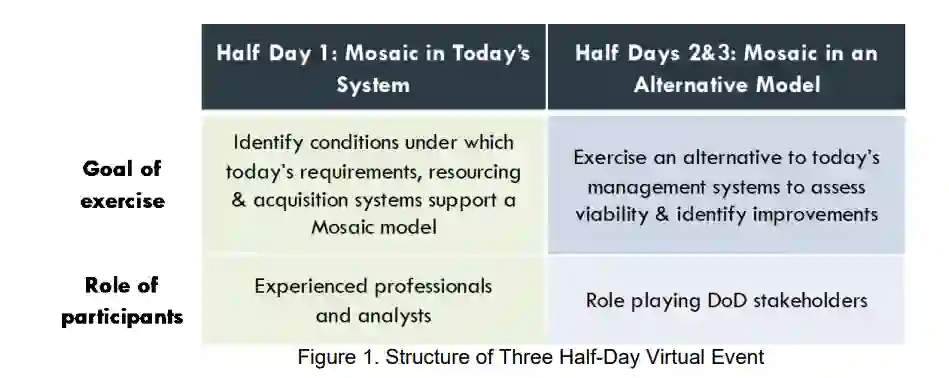为了更好地了解当前和替代治理模式如何与 "马赛克战争 "相结合,我们开发了一个由三部分组成的活动,如图 1 所示。每项活动都以虚拟半天会议的形式进行。这些活动在内部进行了两次,并与兰德公司和 DAPRA 人员组成的混合小组进行了一次。如上所述,这些活动假定 "马赛克战争 "在技术上是可行的,已被国防部所接受,并且已成功实战了一套初始能力。从这一出发点出发,我们要求参与者考虑如何管理单项能力的获取以及整个 "马赛克 "事业。