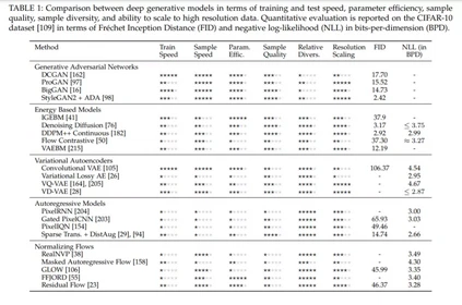 为了简单地了解不同架构之间的差异,我们提供了表1,通过容易比较的星级评级对比了各种不同的技术。具体来说,训练速度是根据报告的总训练时间来评估的,因此要考虑多种因素,包括架构、每一步的函数评估数量、优化的便捷性和所涉及的随机性;样本速度是基于网络速度和所需评估的数量;参数效率是由训练数据集所需的参数总数决定的,而功能更强大的模型通常会有更多的参数,在模型类型之间与质量的相关性不强;一星-一些结构/纹理被捕捉,二星-一个场景可识别但缺少全局结构/细节,三星-重要结构被捕捉但场景看起来“怪异”,四星-与真实图像的差别是可识别的,五星-差别是完全不可察觉的