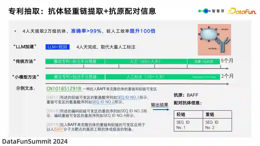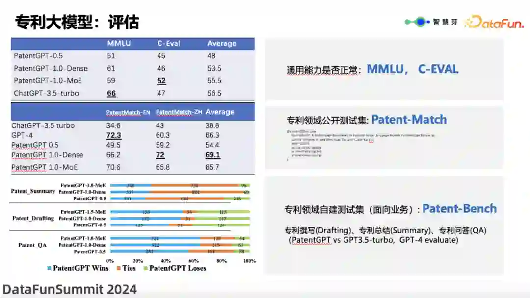 评估任何大模型都是相当有挑战的。 * 首先,评估通用能力。通用能力的不足必然会影响垂直领域的稳定性。因此,智慧芽使用了英文数据集(MMLU)和中文数据集(C-Eval)进行综合评估。就中文而言,专利大模型相对于 ChatGPT-3.5-turbo 具有一定优势,但在英文方面表现普通,与我们英文 SFT 不足有较大关系,现在还在继续扩充中。 * 其次,使用专利领域的公开数据集 Patent-Match。智慧芽主要关注专利的侵权和创新性,而 Patent-Match 数据集可用于判断专利是否侵权。从测试结果来看,无论是中文还是英文,专利大模型在专利领域,都远远超过了 ChatGPT-3.5-turbo,甚至超过了 ChatGPT-4。上图显示了智慧芽不同版本大模型的评估数据。同时也可以看出,Sparse 版本的 MOE 和 Dense 版本之间,也有非常有趣的现象,以后有机会给大家分享更多。 * 最后,对智慧芽自身细粒度业务能力进行了评估,如专利撰写、专利总结、专利问答等。智慧芽使用了专利领域自建测试集(面向业务)Patent-Bench,并采用 PK 方法进行评估,与 ChatGPT-3.5-turbo 和 CGPT-4.0 进行对比。在不同的任务上,表现有所不同:在总结方面,专利大模型相对于 ChatGPT-3.5-turbo 仍具有优势;在专利撰写方面,由于通用大模型缺乏专利知识,专利大模型的优势更为明显;而在专利问答方面,专利大型模型的优势也十分突出,这与智慧芽使用了更深层次、更具差异性的数据集有很大关系。 **6. **专利抽取:抗体轻重链提取+抗原配对信息