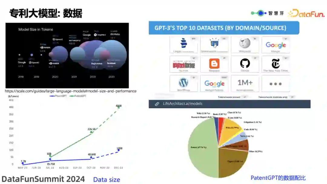 首先来看数据集的大小。从上图中可以看到,大模型数据集在不断变大。最早的 Bert 使用了 3.7B tokens;GPT-3 使用了 500B tokens;LLaMA 1 使用了 1.4T tokens;LLaMA 2 使用了 2T tokens。 智慧芽的专利大模型数据集也经历了从小到大的过程。在实践过程中,数据集变大后,模型的能力提升是明显可感知的。 再来看数据配方。现在许多开源和闭源的大模型都公布了它们的数据配方,这些数据来源包括网络爬虫、代码、维基百科、书籍、论文、新闻等。每个模型的数据集配比都非常讲究。例如,LLaMA 大模型的数据集配比非常杂且全面;而 OpenAI 的 GPT-3 则有自己的特色,强调代码和书籍的训练。这些配比也是大量实验中得出的结论。 智慧芽为了完成大模型训练的下游任务,结合自身的垂域数据集摸索出了专利、论文以及行业领域中独有数据(包括检索报告、书籍等)的配方。此外,也加入了一定量 Common Sense 的数据,因为在连续预训练的过程中会出现严重遗忘,必须有Common Sense 数据的支持,以防止过度遗忘的发生。专利、书籍和论文是智慧芽未来将继续深挖的一个方向。 微软 Phi-1 和最新版本 Phi-1.5 的数据配方以 Textbooks 和 Code为主,使用了较小的参数量,却实现了非常出色的推理能力。这也体现了数据配方和数据质量对模型能力的重要性。GPT-3 的数据配方特点如上图右上所示,可以看到其前三个数据集都以 Text 为主,同时也各有特点,比如第一个数据集以 books 和 journals 为主,第二个数据集也以 books 为主,第三个数据集则是维基百科。GPT-3 大模型性能的优秀和稳定性与数据集的配方密切相关。 **3. **专利大模型:算法是一系列模型