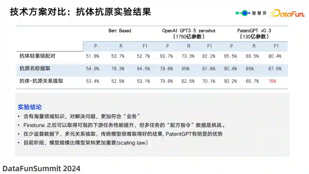 接下来分享应用专利大模型能够解决的实际业务问题。 上图显示了专利抽取的需求,一个生物医药客户需要从专利中获取抗体抗原的配对信息。这涉及到轻链、重链以及它们对应的抗原等关键数据,在生物医药领域至关重要。特别是对于大型药物公司,其核心药物都受到专利保护,因此准确提取这些信息至关重要。然而,在过去,数据集的准确性和提取都需要人工干预。要实现客户的需求,使用纯人工方法完成需时 5 个月;使用小型模型结合人工标注(并由人工审核)需时 2 个月;而通过专利大模型,经过 Lora 微调、全参数微调、指令微调等方案,仅需 4 天即可完成任务。**7. **技术方案对比:抗体抗原实验结果